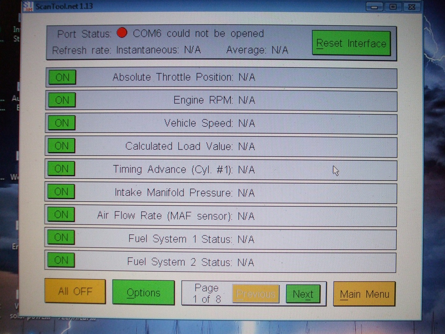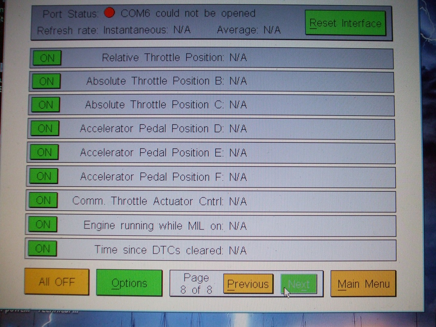 Hey DeBe, it looks like it's not communicating with you I/O port (Port Status Com 6 could not be opened) did you get any meaningful readings from it?
