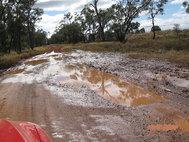I would never have gotten bogged in this, I would have been more concerned about how rough it was going to be for my very low car and the little camper trailer I had at the time. But you can't really avoid it being rough, because you can't go slow. As for the depth of the puddles, June in western Qld is not when one would want to dip ones toes in puddles. If there'd been water right across the road, I would have had to brave it. Note: Pays to carry gumboots, which I now do.