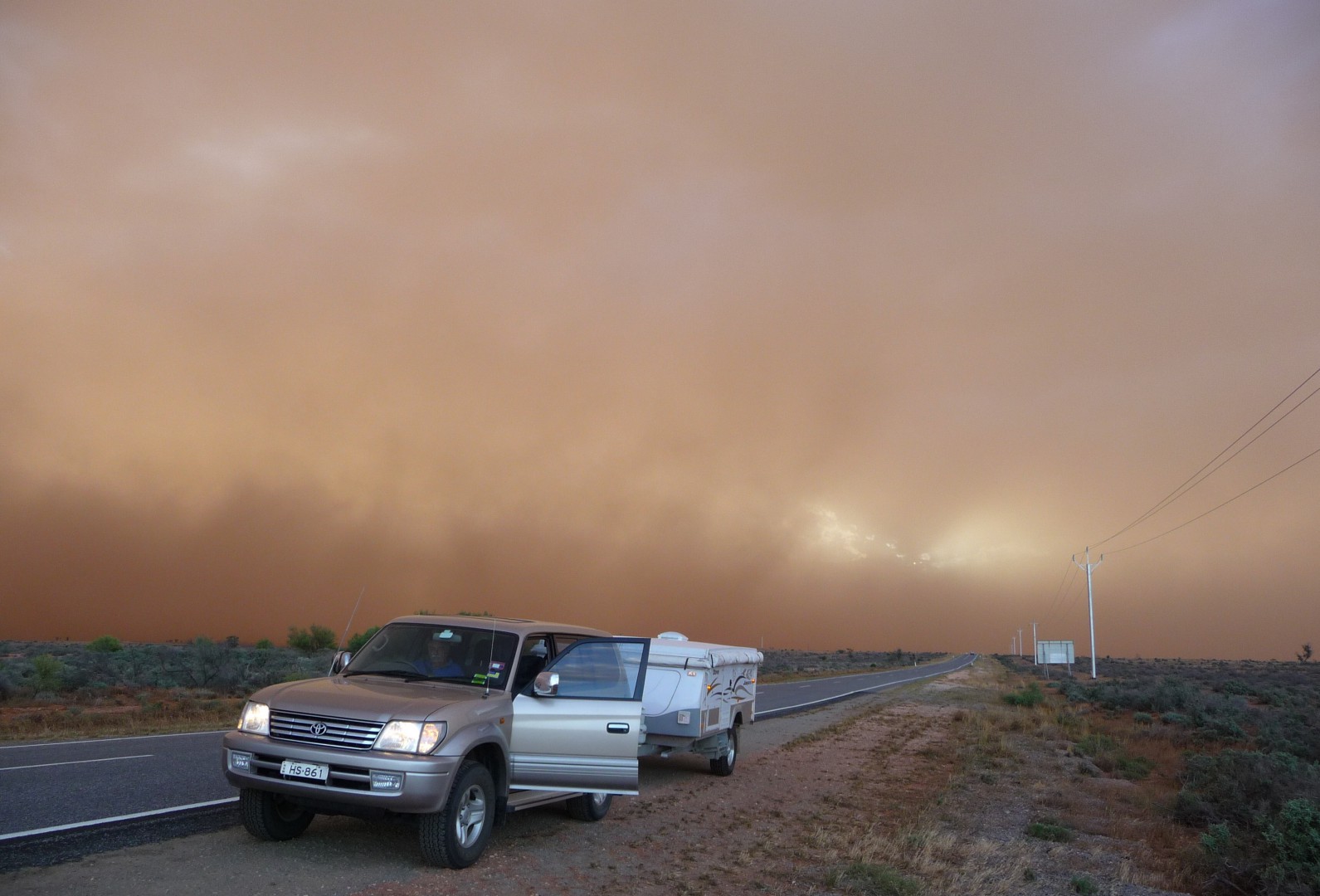 This huge dust storm was following close behind us as we drove towards Broken Hill on the Barrier Highway. We stopped for a while to let it blow right past us.