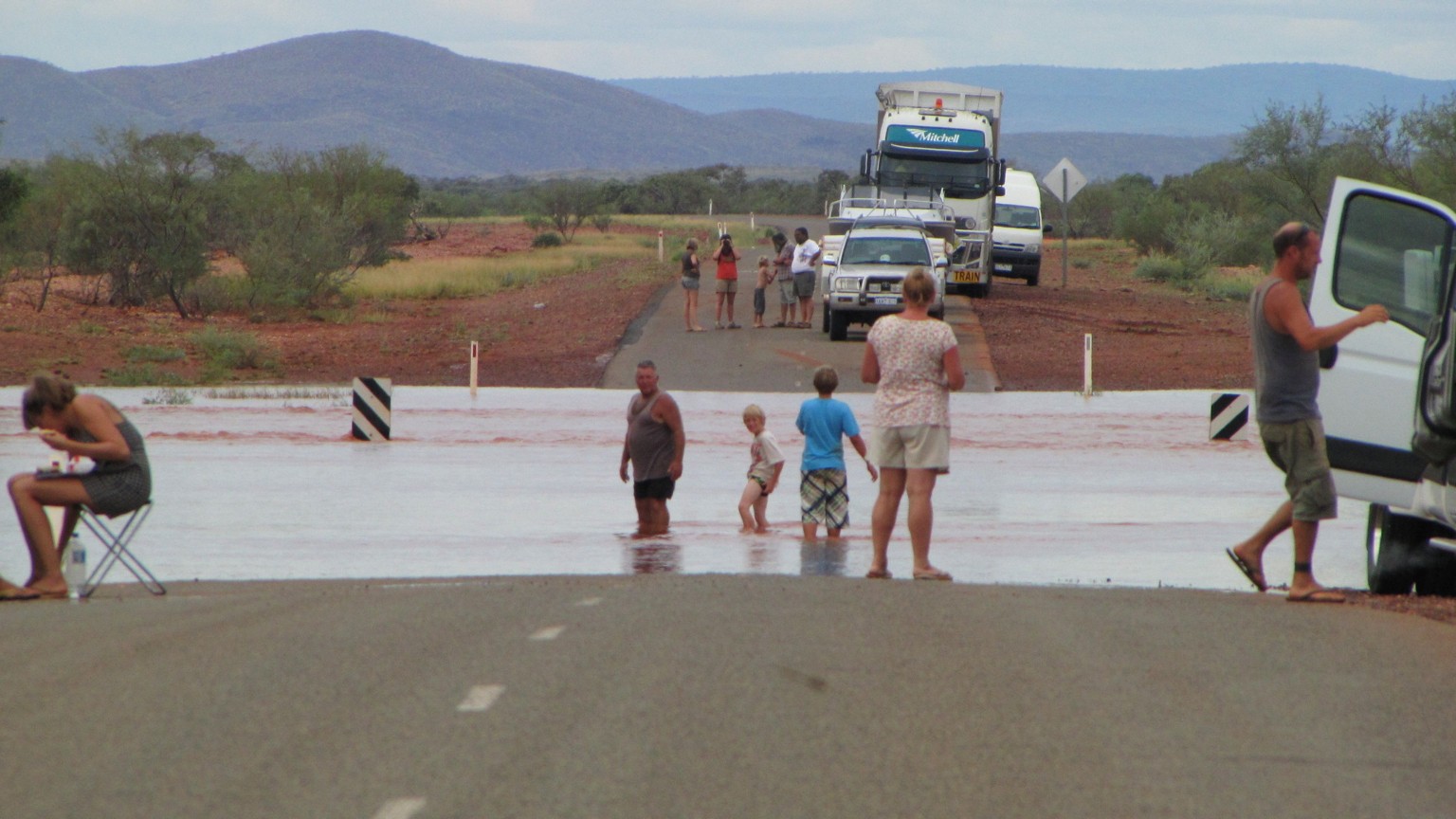 We were on the way to Tom Price WA. Many parts of the road were flooded but this was the only part that was too deep for anyone to cross. We finally got across at about 5pm and parked in a little towns car park adjacent a school as there was no caravan parks or legal spots available.
