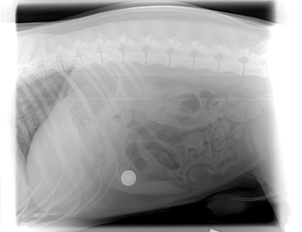 Xrays showed that he had swallowed a nice sized round fishing sinker (about 50 grams in weight).