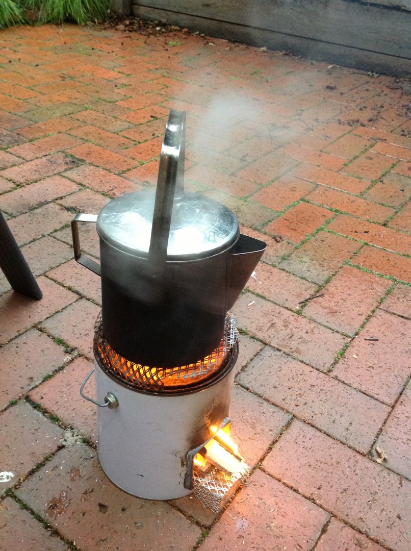 Here is mine made from a paint can, some scrap steel tube and pearlite for insulation (available at Bunnings in the garden section). It works a treat!!! (That's steam from the water boiling, not smoke)