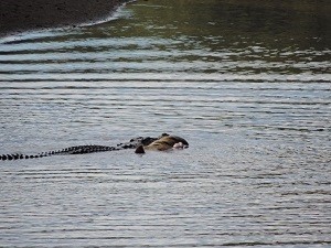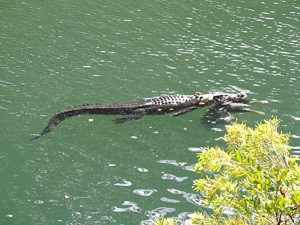 Some photos of five different sal****er crocodiles on 2kms of the lower reaches of the Mulgrave River in Nth Qld (River is Freswater here but not far from Brackish/Salt). As long as people heed the signs erected there should not be any incidents, but there have been some seen close or in these waters.!!. The photos were taken at 9:30am on Friday 16/08/2013, we did not realize what was to unfold as the croc was stirring slightly, then aggressively and the body of a wild pig floated up beside him. The photos of the pig hanging from his jaws were taken from a 100 ft high bank as he slowly floated down river.