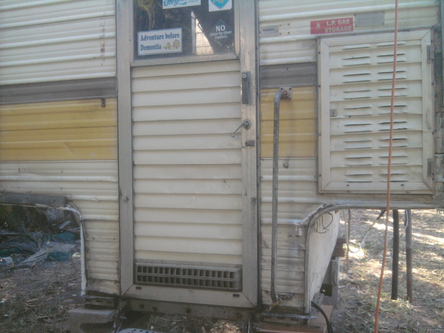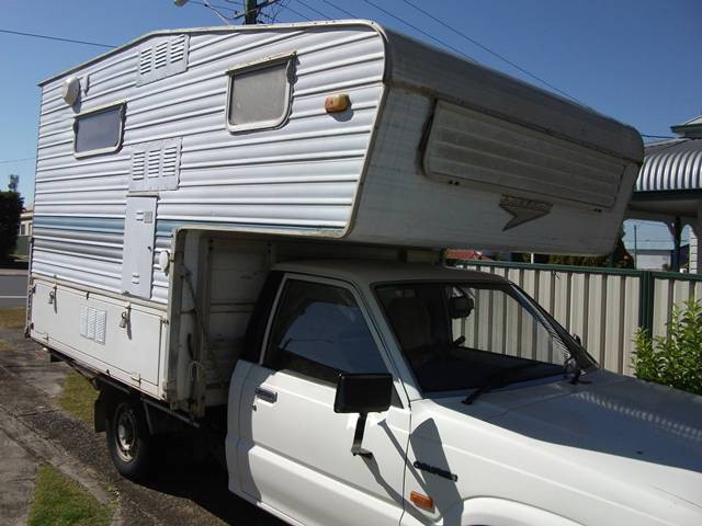 Here is a coupleof pics of the railat the back of my camper. It swivels around and acts as a security bar which holds the stairs up, andyour can lock it with a padlock works well. Shouldn't be too hard to make. The rig will be a lot more stable now you have removed the box.Sorry, can't do anything about the fuel consumtion. 2.6ltr petrol mazda/ford engines use a lot of fuel. Might come down to see it(and you), later in the year, if you are around. Bill