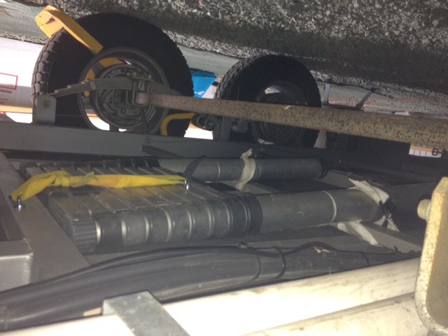 Have any of you seen those ladders that collapse into themselves ? They go to about 3.5 mtrs. Well as a maintenance plumber I had one on the front of my works trailer it was handy for manholes and on industrial sites over machines etc.Sadly the bottom rung snapped off recently as I had a 50 litre hot water unit sitting on my left shoulder and took one step and that was it !! Plus I would not let anyone use it bar me as it did not conform to worksafe standards.Anyway being semi retired and sitting in the shed your thoughts turn to the odd challenge.I know ! sez me I,ll bung it under the van! I know some folk don,t like crawling under vans but since I still regularly crawl under houses in mud etc for burst pipes its no big deal.I have put it directly behind the second water tank so its protected from stones etc. I used a small loop bracket and an angled piece of steel at the front to support the weight and then just lifted up the back and used 2 self clamping tie downs on to the frame. One just has to remember to take a really big step on the first step ! So next time your in a C/Park and you decide to re roof your van just seek me out and its out for you in 3 mins ! Cheers .