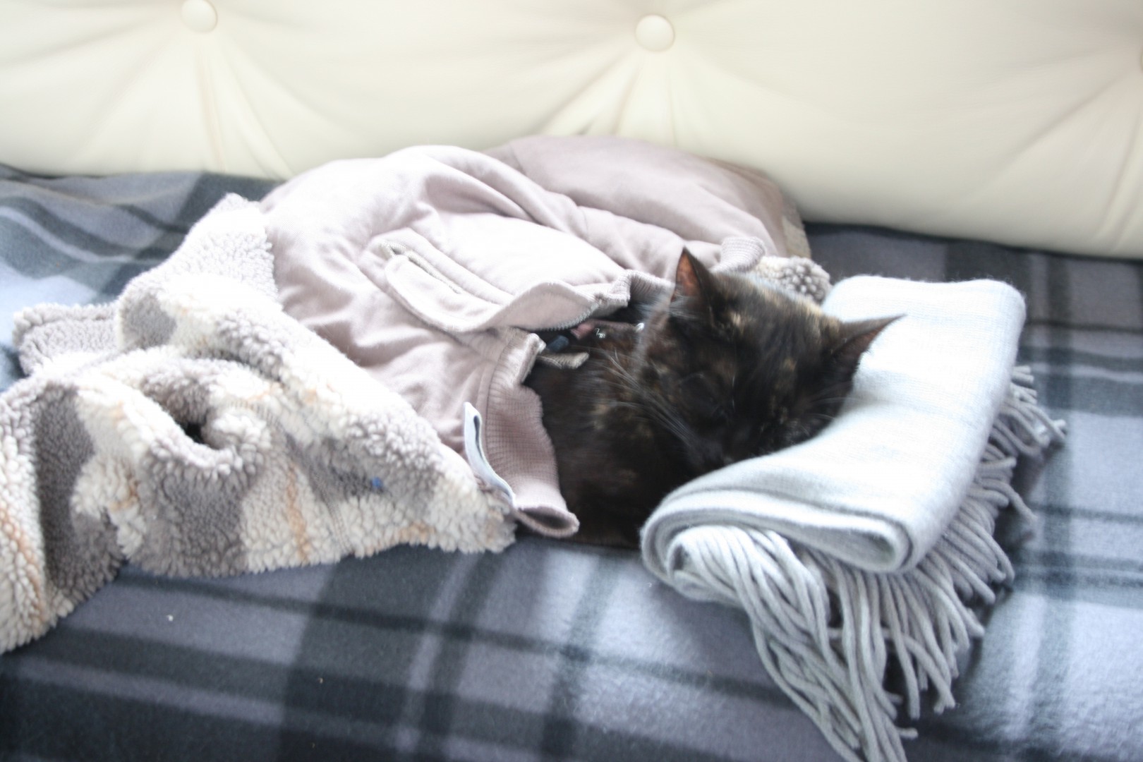 When we set off we were advised that cats don't like to see the world moving past them and that they travel better in an enclosed space so we bought a collapsible kennel for her. Turned out that she didn't like being closed in and so she travelled around the country looking out the windows all the way.