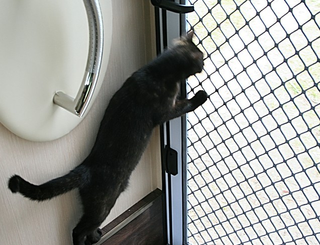 Ziggy had adjusted to life as a travel pet really well, we have trained her to use a harness and a lead so she is safe when outside the motor home... and she even likes to use that at home in her own garden. We like to free camp, so we try to choose camp sites where there are some trees available for her to run up, it's a great photo opportunity to have a pic of the kitten running up a tree on her lead! Ziggy is no trouble at all when we travel and she has all her home comforts on board. Don't just take your dog away and leave the cat at home - you are missing out on so much.