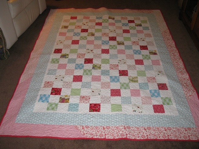 And finally an easy 3" squares quilt ordered by a friend which she wanted stippled. Arggh. Stippling gives me a dreadful pain in the neck and I can only do it in small doses. I so enjoy hand quilting compared to machine quilting by me. I've only ever had one quilt machine quilted by someone else. It was just too big and too many seams to handquilt.