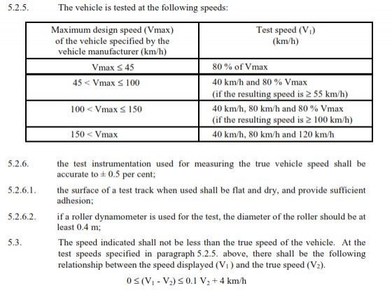 - Vehicle speedometers to indicate a speed equal to or higher than actual vehicle speed and no more than 10% + 6 km/h higher than actual speed.