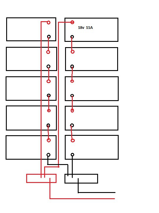 In this configuration, you would have 90 odd Volts ( 5x 18 Volts ) and the current would be 22 Amps ( 2 strings of 11 Amps each string ).