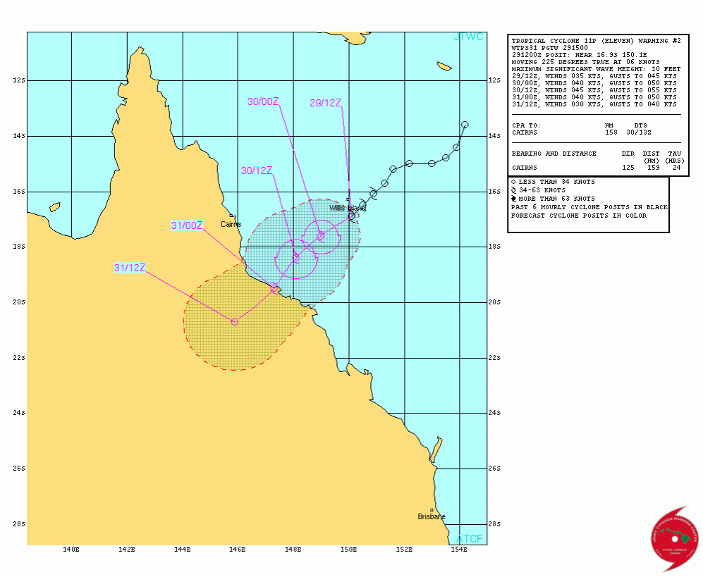 DAMAGING WIND GUSTS to 120 kilometres per hour are currently occurring in coastal areas between Ayr and Sarina and will extending to adjacent inland areas later this morning. DESTRUCTIVE WIND GUSTS to 140 kilometres per hour may still occur close to the system centre during the next few hours. These winds are expected to ease by late morning.