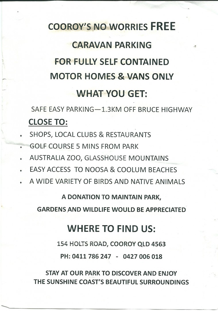 I saw this on the bulletin board at Pomona at the Sushine coast, QLD.I hope it helps some GNs. Bill Ps I had a look this morn, and is a nice flat gravel area with water(don,t know if its drinkable) about 1.5klms from Cooroy which has supermarkets , shops , etc.For self contained units. Seems very nice. Caretaker onsite. Used to be a nursery. Bill