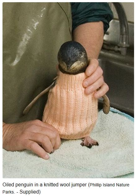 Penguins caught in oil spills need the little jumpers to keep warm and to stop them from trying to clean the toxic oil off with their beaks.