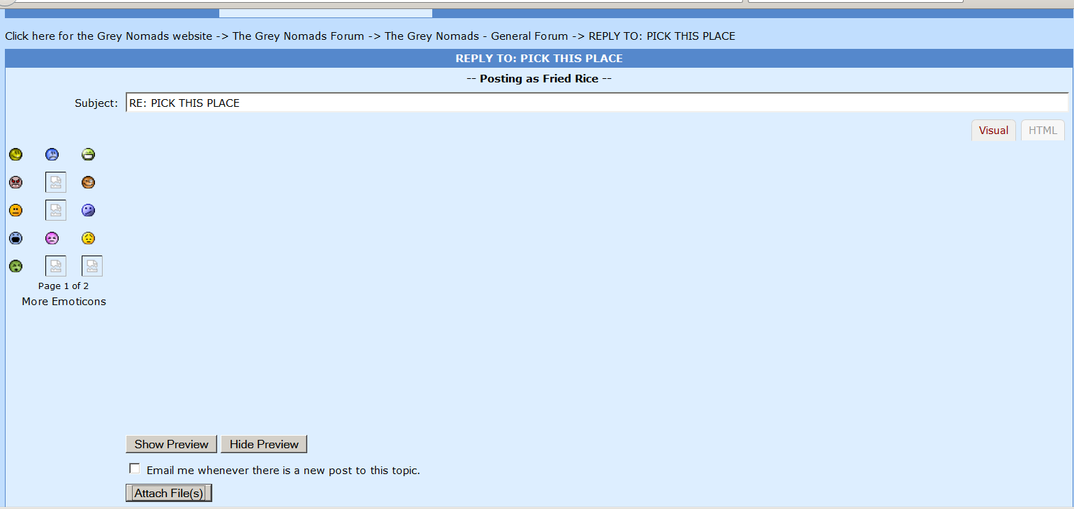 All works OK with IE on my lappy; works OK on Felicity's laptop with FF; forums in other sites work OK in FF; I have removed and reloaded FF; blank emoticons don't open in FF but you can see them open here. All updates are done. As far as I can tell this glitch only occurs during the association between FF and Grey Nomads Forum on my laptop.