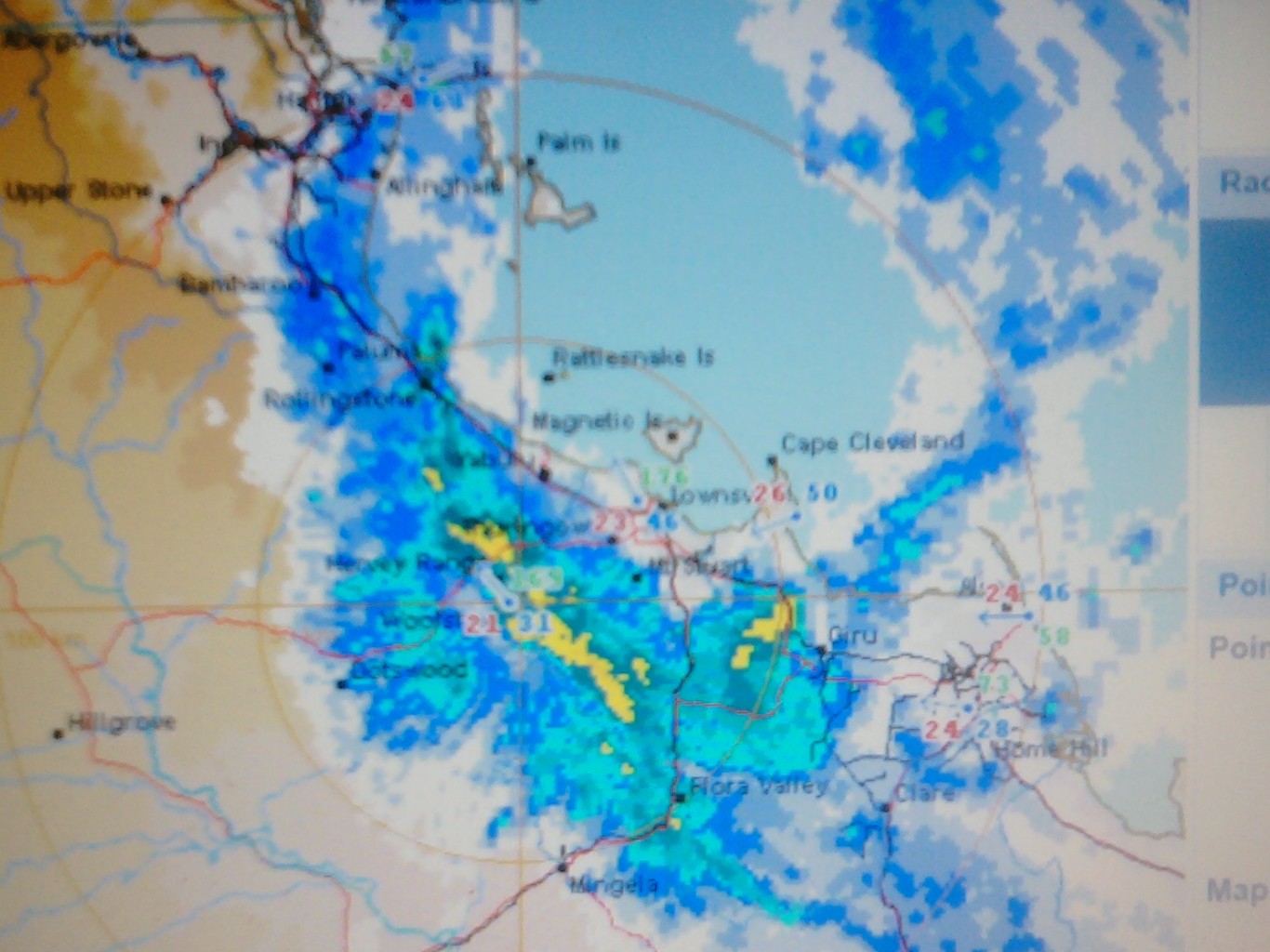 At the moment we are in the eye of the cyclone, and there are 5m waves breaking on the beach at Horseshoe bay. There is some idiot out in the bay on his yatcht, on a mooring , with no motor, withhis sails up. Its going to come in strong northerly , up tp 60knots, by mid morn.Ihave called the coast guard, but what else can you do.Here is a pic of the current weather radar.