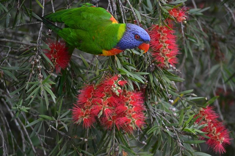 Trying to photograph one of these parrots is like trying to photograph a flea with feathers. Talk about active! But I managed to get this shot yesterday while hundreds of the birds feasted on the blossoming bottlebrush trees in the street outside my place.