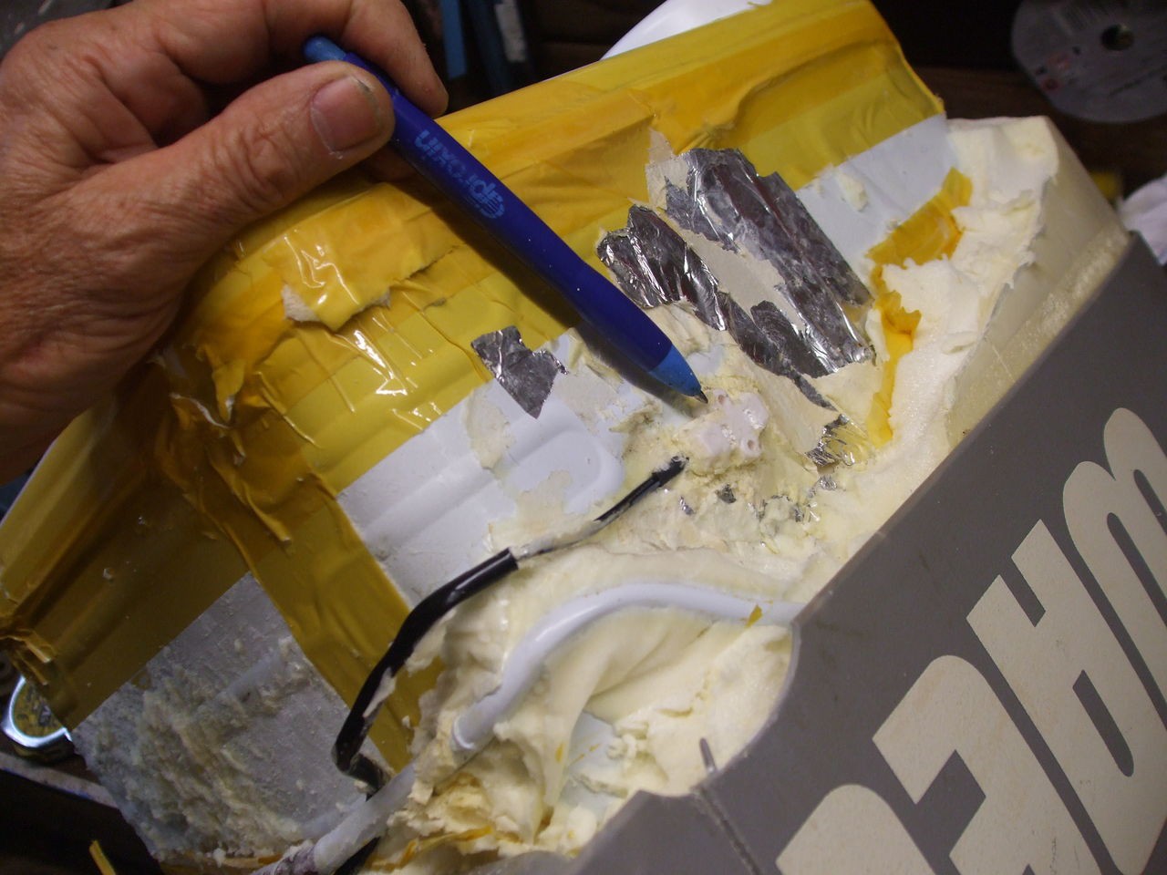 all cut and glued in, there is 3 pieces but was trying to find the wire. the fridge bag will cover the joins I put a small hole on the out side of the compressor so now there is no need to take the compressor off at all Quick easy fix, pull pieces out, did out foam, glue new thermistor in and plug in thermister to the board, stick piece bag on, ALL FINISHED I would also like to thank DEBE ,Daryl, for his help on this Regards Peter bloody hell, hope it all works after all this