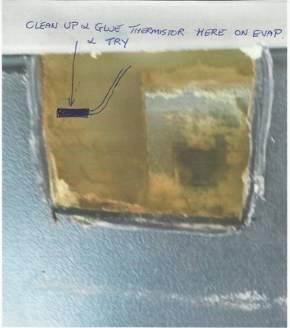 This is the recommended way of fitting, but be careful. 1. 100mm in & 25mm down, heat a 24-30mm metal tube & burn a hole in through to the evaporator. Clean it all the way in to the alum evap (do not drill). 2. Stick the thermistor to the ally evap with araldite. 3. Fill the hole with foam. 4. After dry cover with silicone. Borrowed the pics from another forum im on & they were posted in Waeco disassembly which I started, & pics were posted by bob& bev.