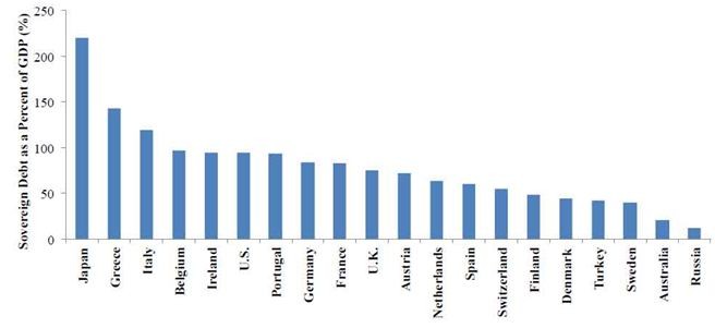 [Sovereign debt is the amount of money that a country's government has borrowed, typically issued as bonds denominated in a reserve currency.]