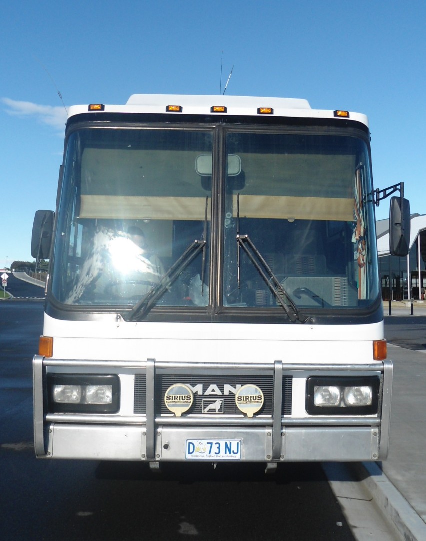 She's a 1992 MAN 10180 cylinder diesel mini-coach. She recently (just finished today) got her windows removed to be reclad and have motorhome windows fitted. We think she looks great! The work was done by CP Motorhomes in Ulverstone Tasmania; they were fantastic with us, would recommend them to anyone. She also has a built in tyre inflater thingy (attached to her airtanks), which comes out the front bumper, as seen in the last picture - Troy built that.