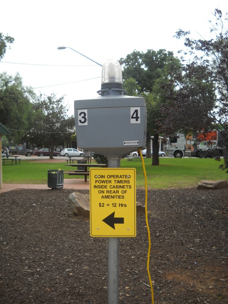 Ardelthan, a small town off the Newell Highway between West Wyalong and Narrandera, NSW. Camps 7, Map 43, Site 828. A very small town and in the main street, adjoining the Bowling Club is a FREE camp. Power is $2.00 for 12 hours, so if you stay 1 night, pay $2.00 around 7 pm, you'll have power until 7 am next morning. I stayed 2 days, so power cost was $8.00 for 48 hours. IGA across the street, many small stores, clean toilets. Where could you get a better deal. There is a Caravan Park in town and I heard it charges $28.00 for a powered site. Understandably it was almost empty...There are only 4 powered sites, so first in first served.