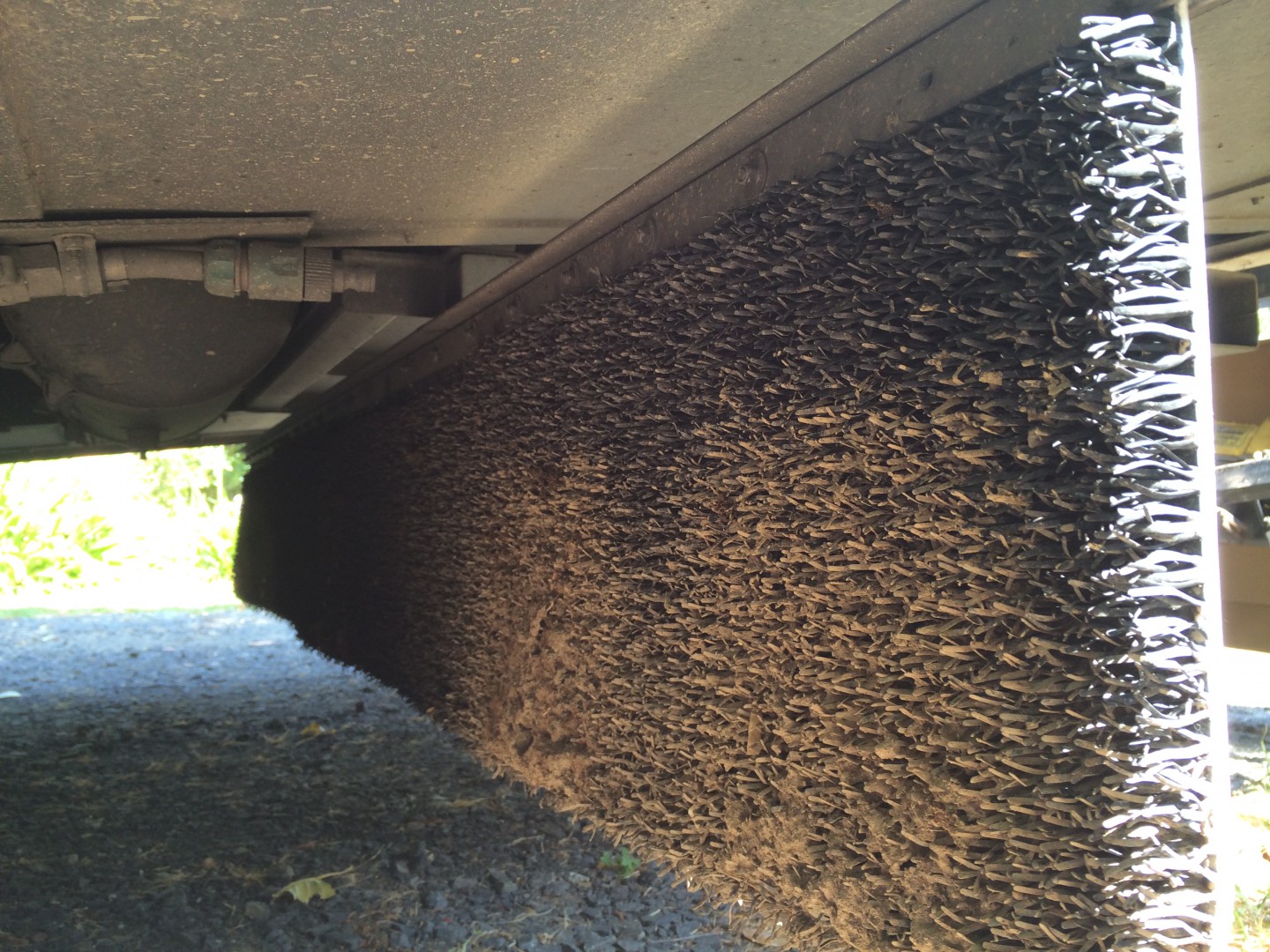 These are just the anti spray mudflaps you find for trucks, Two cut in half and the four then mounted across the full width of the MH. I used a piece of 25mmAngle and a 20mm piece of flat bar clamping the flaps between them and mounted to the underside of the MH. It is not 100% but I would say it's about 90% effective.