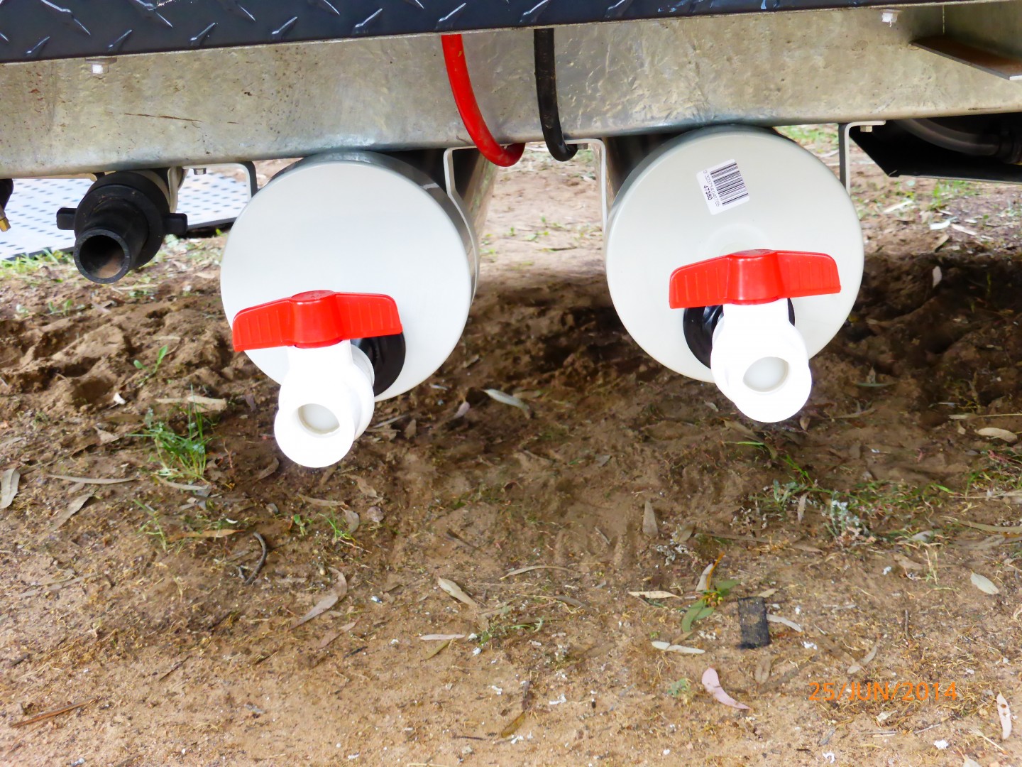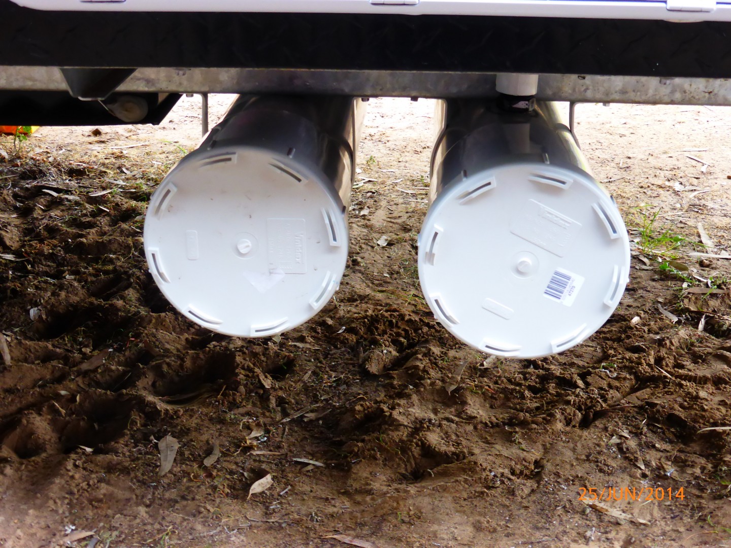 Methinks it's JohnR that has the pipes. Currently I use a hose to the sullage trap on site ... a bucket for one night stays. To date not stayed at a free camp ... Still looking, still learning the ropes ... Until recently not towed for over 30 years. Are looking at a 20litre drum ... We only have dish water waste ... No toilet, No shower ...