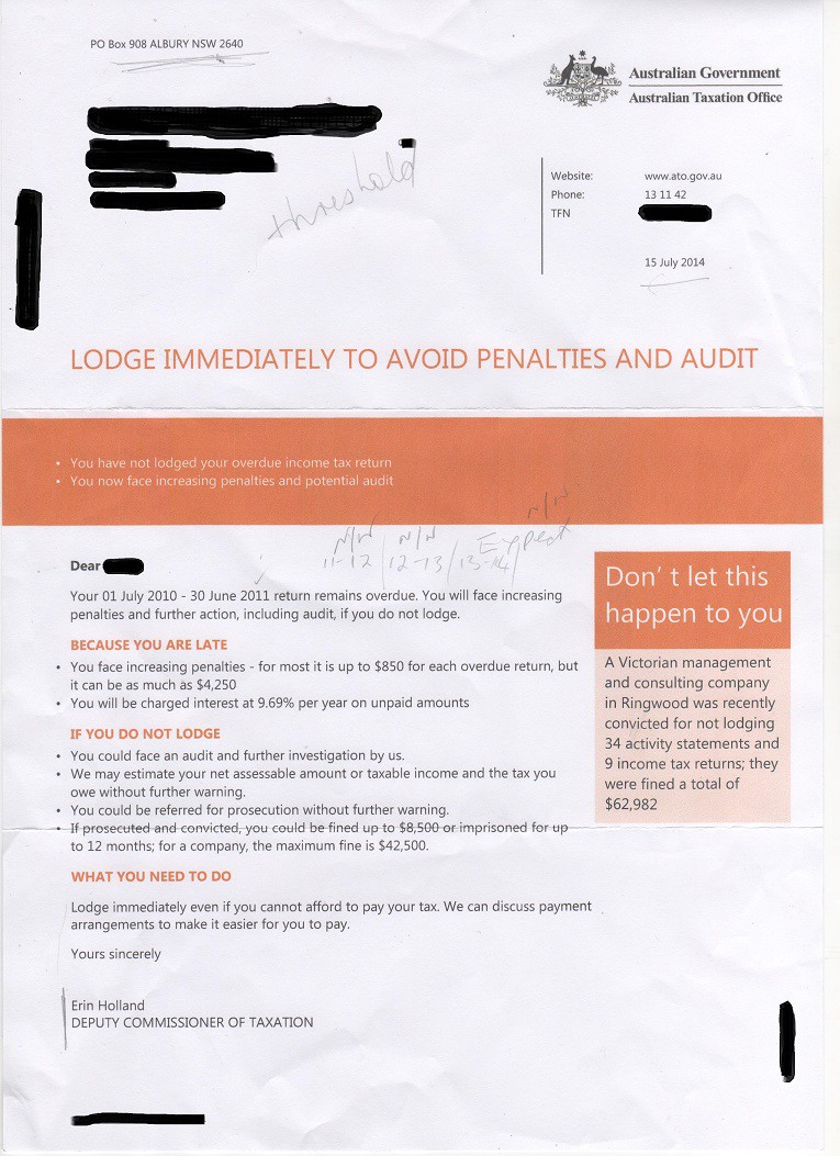 Apparently according to them she owed $2 (two dollars) and should have lodged a return in the 2010/2011 tax year when still a pensioner.