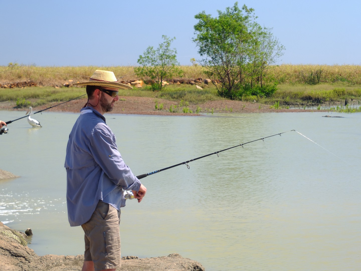 We were at Shady Camp (on Mary River) from 6th August. Saw plenty of salties. Some French tourists were planning to swim on the fresh water side of the barrage, about where the guy in this photo was fishing. Note the croc in the background.