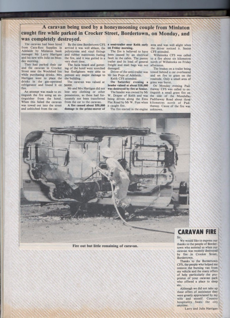 I ""confidentially"" told the Police who attended, I was a Minlaton S.A. Bank Manager on my honeymoon....mistake!....as we returned through Bordertown on our way home I wondered if our fire had made Page 8 near the Local Show results: flower/cake making winners.....it was the paper's bloooody headlines!!...imagine if I had simply been on a dirty weekend minus my wife?....?