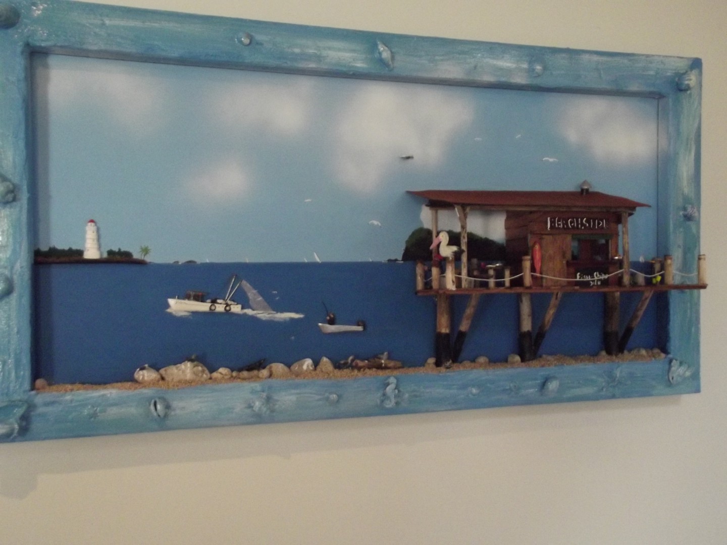 The small seafood café is made from teak and boats and birds are all had made . It gives the realism a different aspect. The frame is handmade and carved.