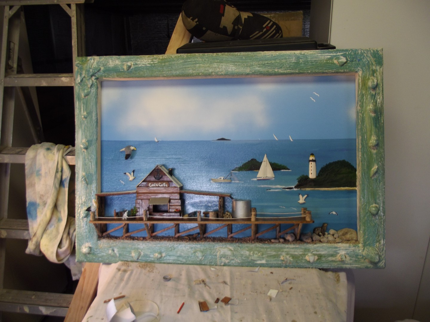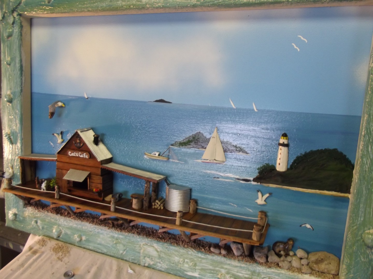 Another one !! All boats , mammals/ birds and jetty (teak) are hand crafted. Frame is pine and the pylons are driftwood. Ocean is acrylic.
