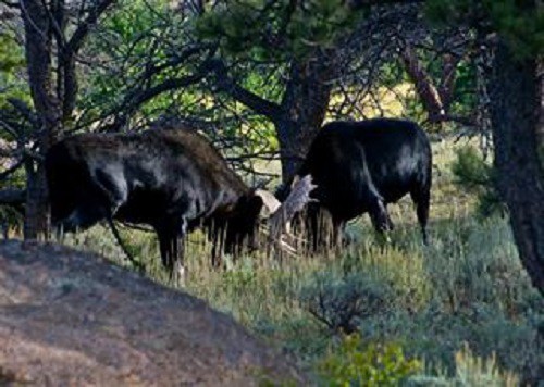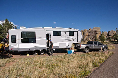 A year ago we were dispersed camping at Vedauwoo, Wyoming and were awakened to two Bull Moose fighting for 45 minutes with 25 metres of the rig. Well, I slept through most of it whilst wife, son, daughter-in-law and year old grandson were enthralled. Photo of Moose and campsite. Vedauwoo has several good dry camping Forest Service CGs as well. Vedauwoo is one of the primary rock climbing spots in the US with 100 to 150 metre tall rock formations found over a 10 km area. The rock formation in the background is about 120 m tall.