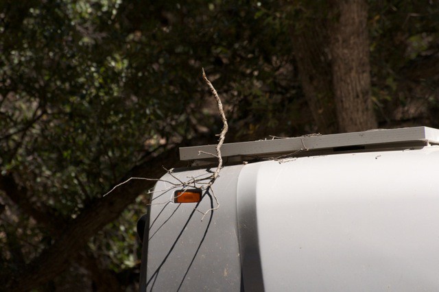 The batteries have lasted for six days of strong usage in heavy shade. Photograph of spot in Arizona where we had total shade for that time. We were only down to 50% depth of discharge but LFP are supposedly good for 2000 cycles down to 80%. Managed to take off a few branches going in and going out - but panels remained.