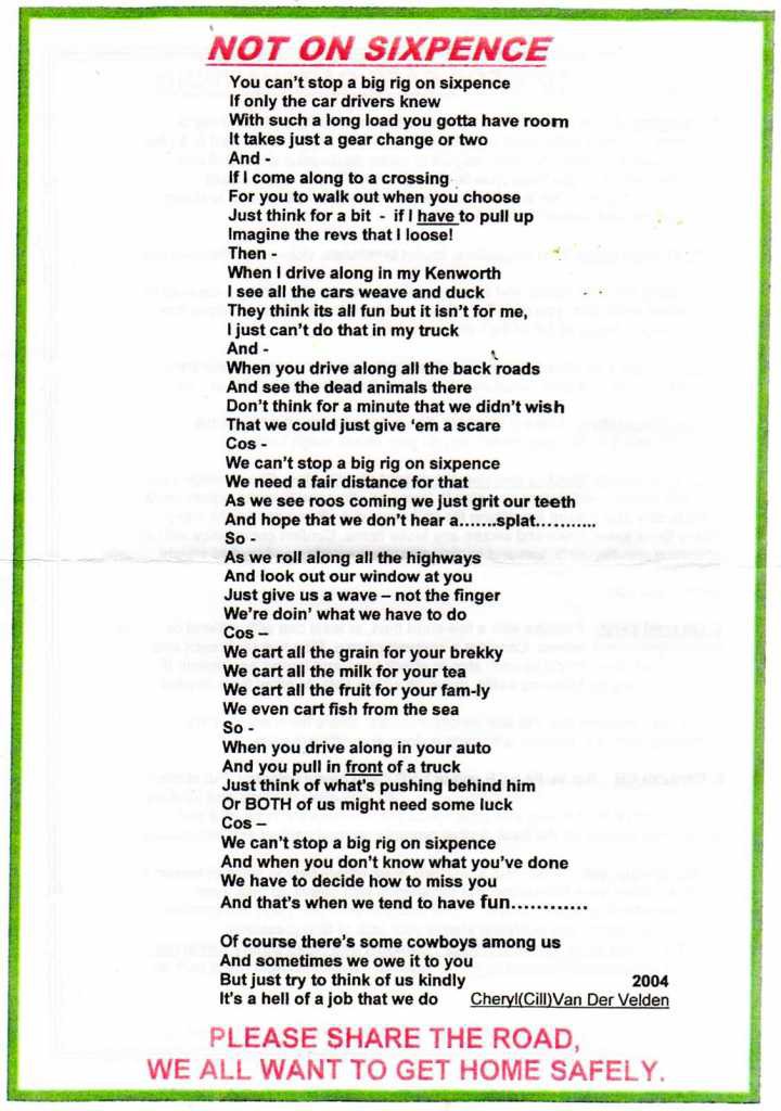 So folks, (me again) hope we can be among the ones the truckies love, I have suggested on the ACC forum we see if we can get that letter out there into the caravanning magazines, the last thing we need is to be offside with these guys,