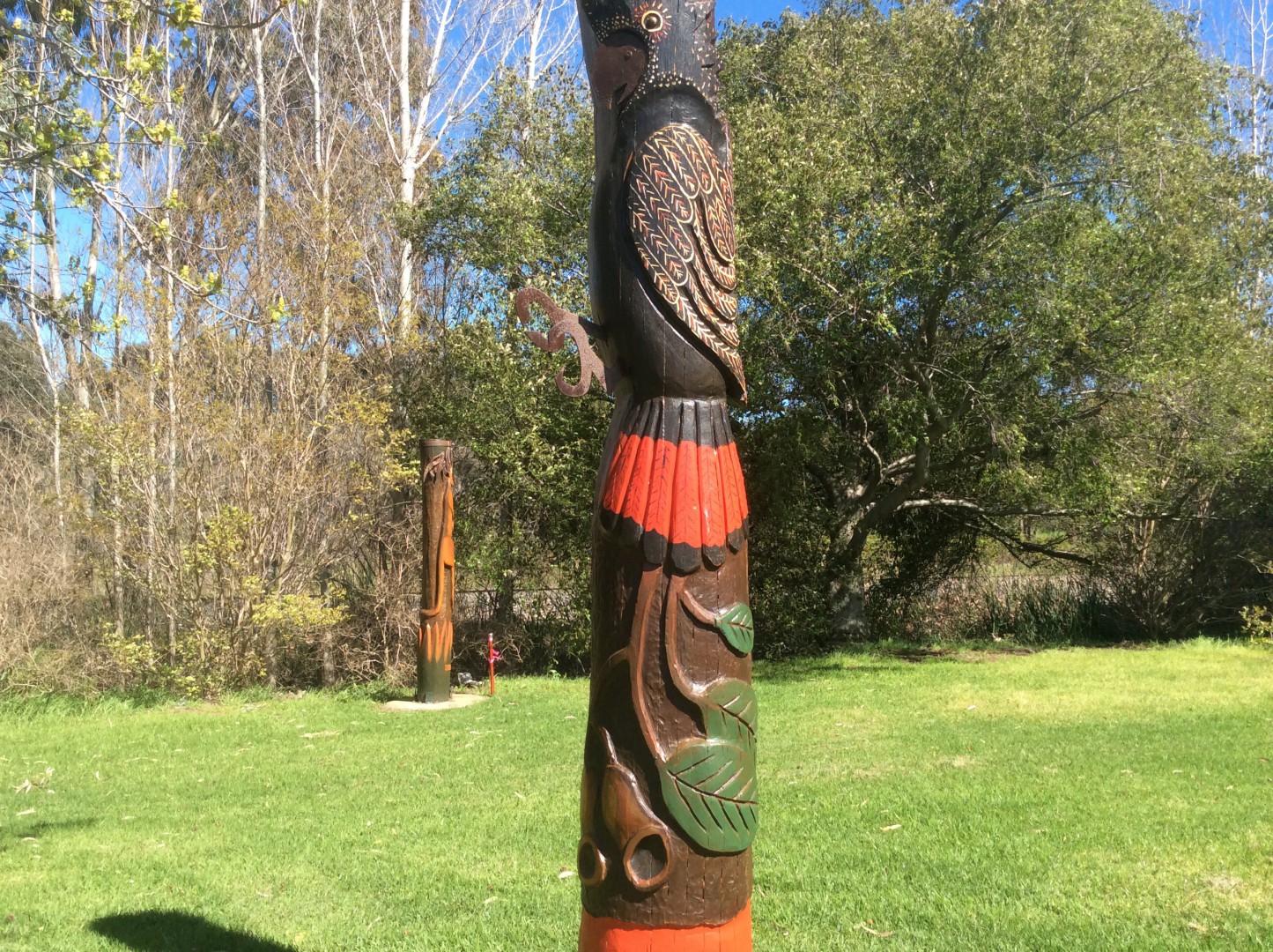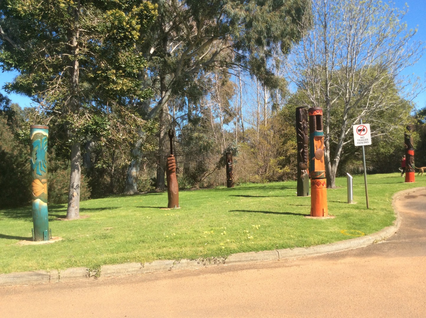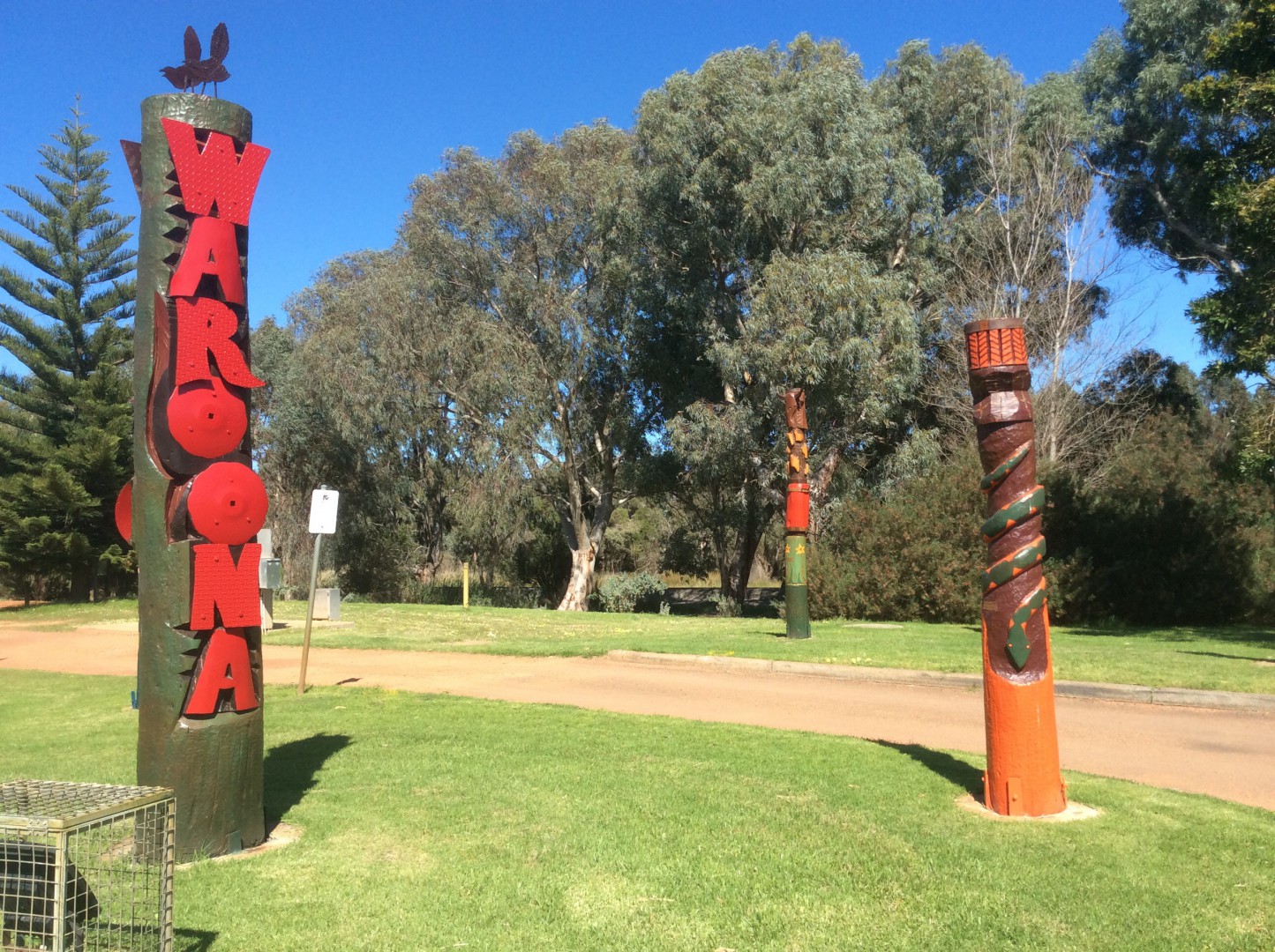 Left Perth this morning headed for Bunbury via the South Western Highway. Lovely drive as a change from coastal areas. Pulled up for morning tea at a nice bakery in Waroona. These carved "totem poles" were across the road next to the Information Centre.