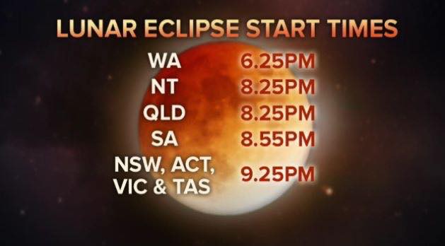 I didn't even know there was a lunar eclipse tonight but if you're interested the starting times around the country are:
