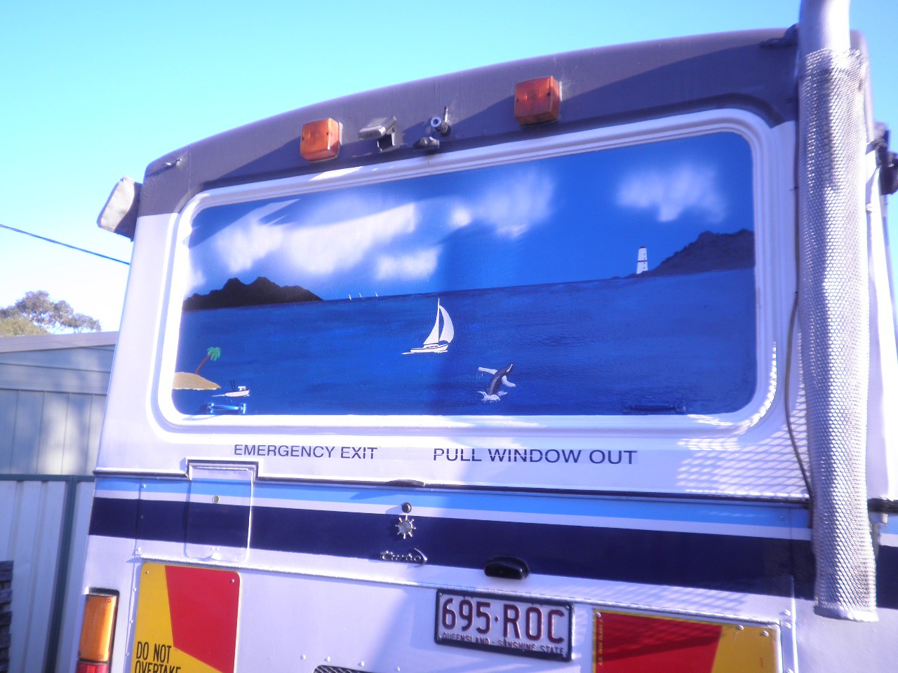 Hi Frangipani , I just clean the glass with thinners and use 3 coats of outdoor enamel as it endures weather better. When we stop somewhere for a while, we have a rear shade cloth so it will be shaded somewhat.