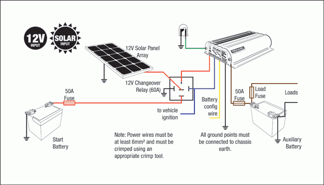 Woody I would suggest a Redarc BCDC 1240 http://www.redarc.com.au/products/product/in-vehicle-battery-charger-40a/ to charge from your motor and this DC DC charger also has a MPPT solar regulator built in , a change over relay needs to be fitted between the lead from your starter battery and the charger to connect the solar panel to . Purchase a 240v multlistage charger to charge off 240v . The Projecta 240v charger seems a good charger .