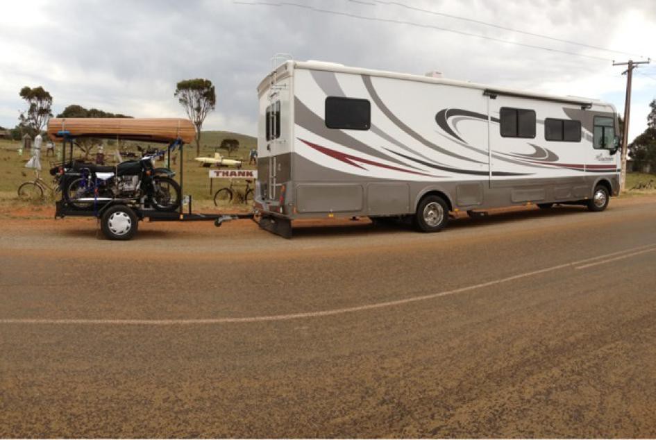 The rig on the highway. Sidecar outfit provides touring and shopping once we're settled. The canoe is a home built 18' cedar plank canoe cut in half to fit the trailer. Bolted together once it's on the beach to go exploring or fishing.