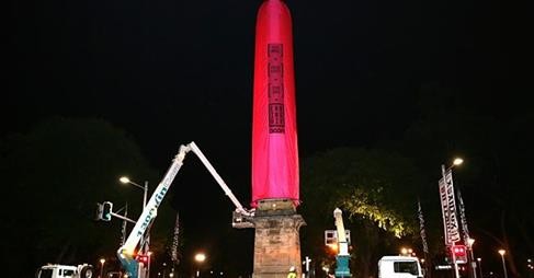 Gary Kelly , wrote, ---- A giant pink condom has been erected... no, sorry... make that placed over an 18m Sydney obelisk in Hyde Park to bring attention to HIV awareness. Some members of the public welcomed the installation while others were not so impressed. Dunno why. What's wrong with pink?