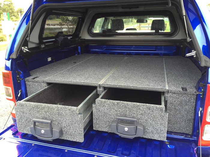 the drawers cost $2569 fitted. This included the side panels where extra storage is provided. The second battery is under the passenger side panel and there is room for tarps etc under the drivers side panel. A lot of $$$$$ but I feel it is worth it to have things stowed away securely. The drawers are 1255 X 435 mm (full length)