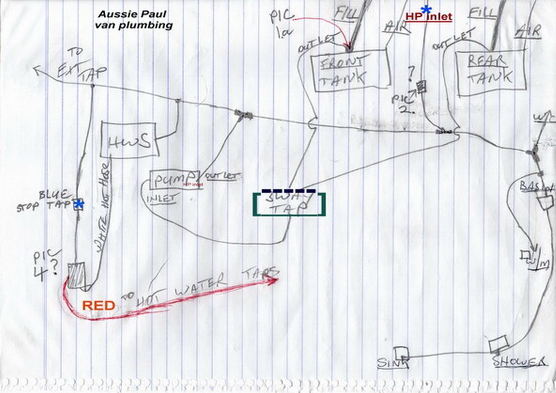 Ok. after some laying around under the van I have a hand drawn cold water plumbing diagram. Does it make sense??