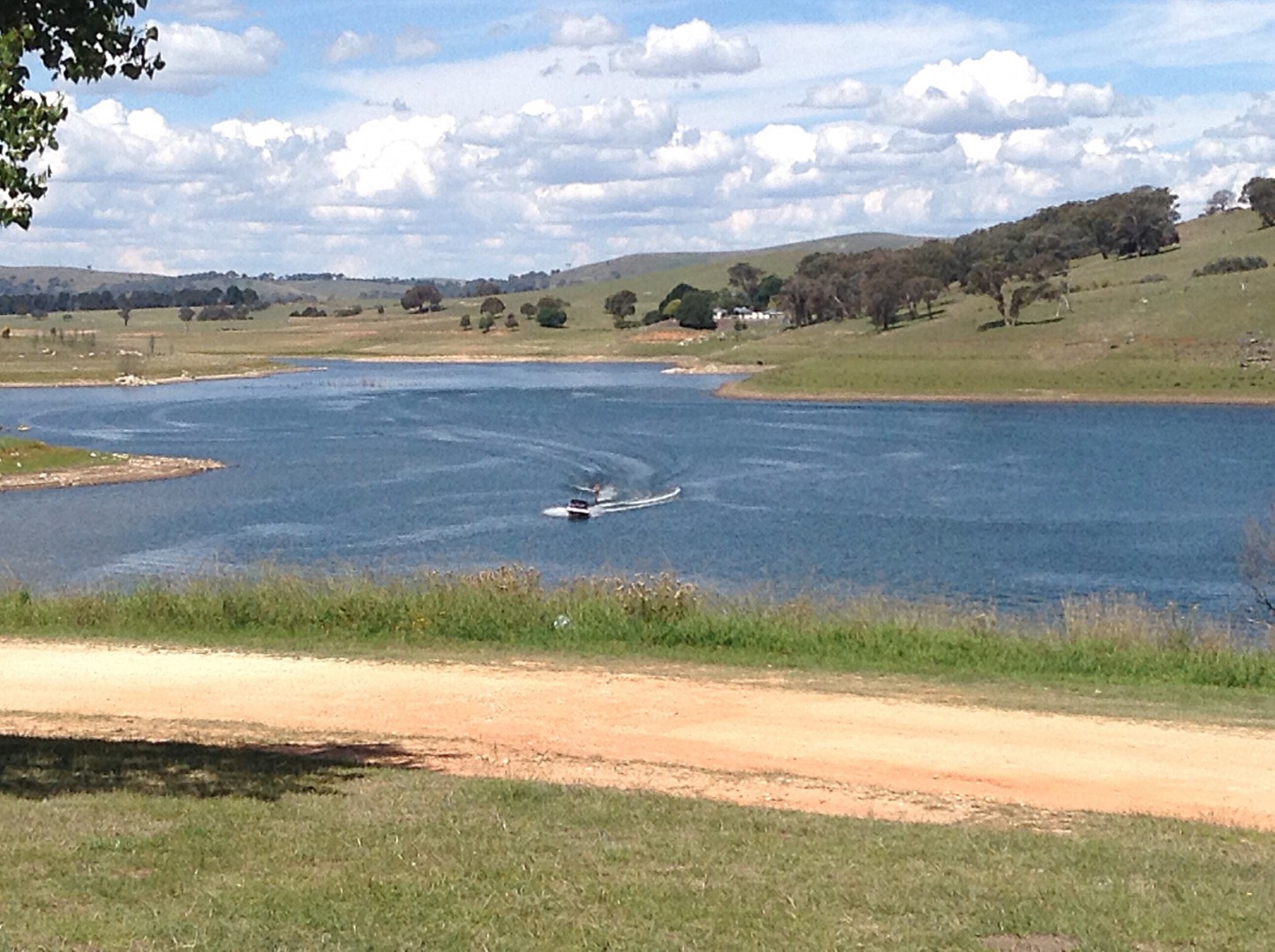 We had rain and wind last week, but since Friday it has been lovely - few boats come out, skiers, biscuits - have fun. There are a few fishing boats come as well. The water level is down to about 30%, so the surface area is a lot smaller than usual.