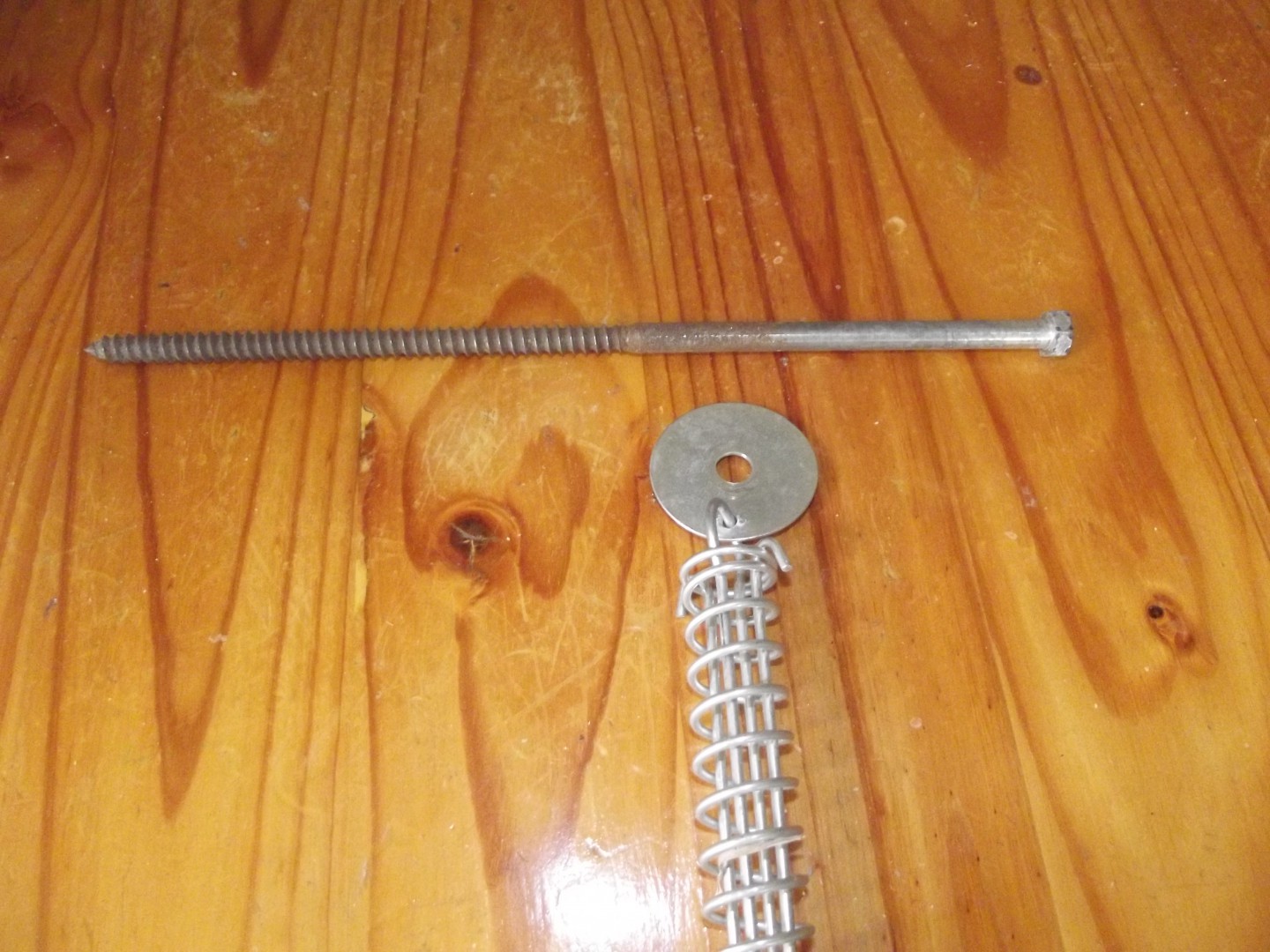 My 30cm (12-inch) screws. The washer is 50mm outside and 10mm inside diameters. Just drill a 4mm hole in the edge, remove a center loop from the spring, thread the washer onto it and slide the loop back through the spring.