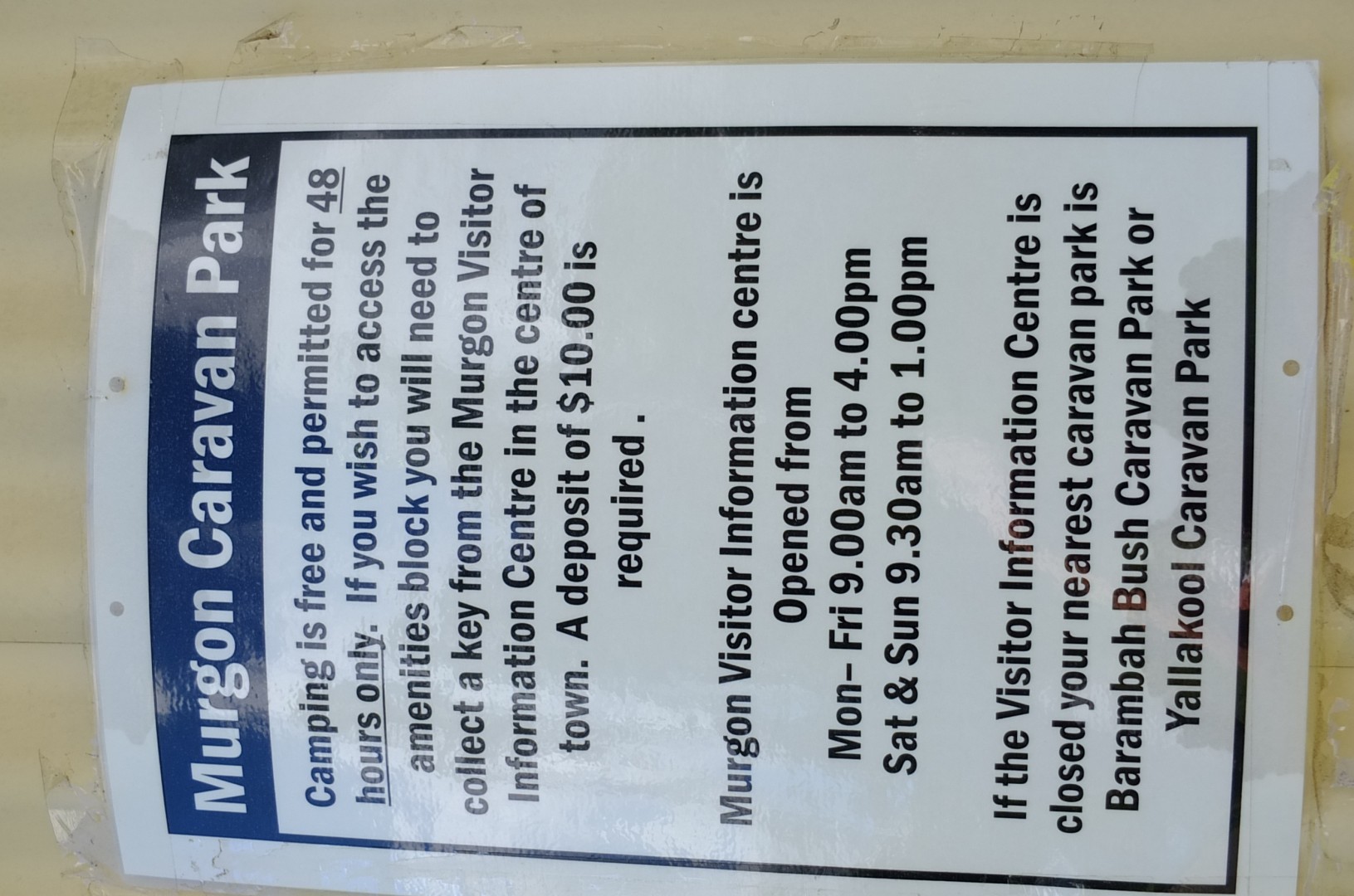 The old council caravan park in Kreb Street, Murgon (formerly $+ in camps 7) is now a free 48hour stop over. If you need to use amenities, you pay $10.00 deposit for key from Information Centre. Level shady or sunny sites, caravan slabs, some drive through. Right in town, walking distance to IGA and other shops etc.