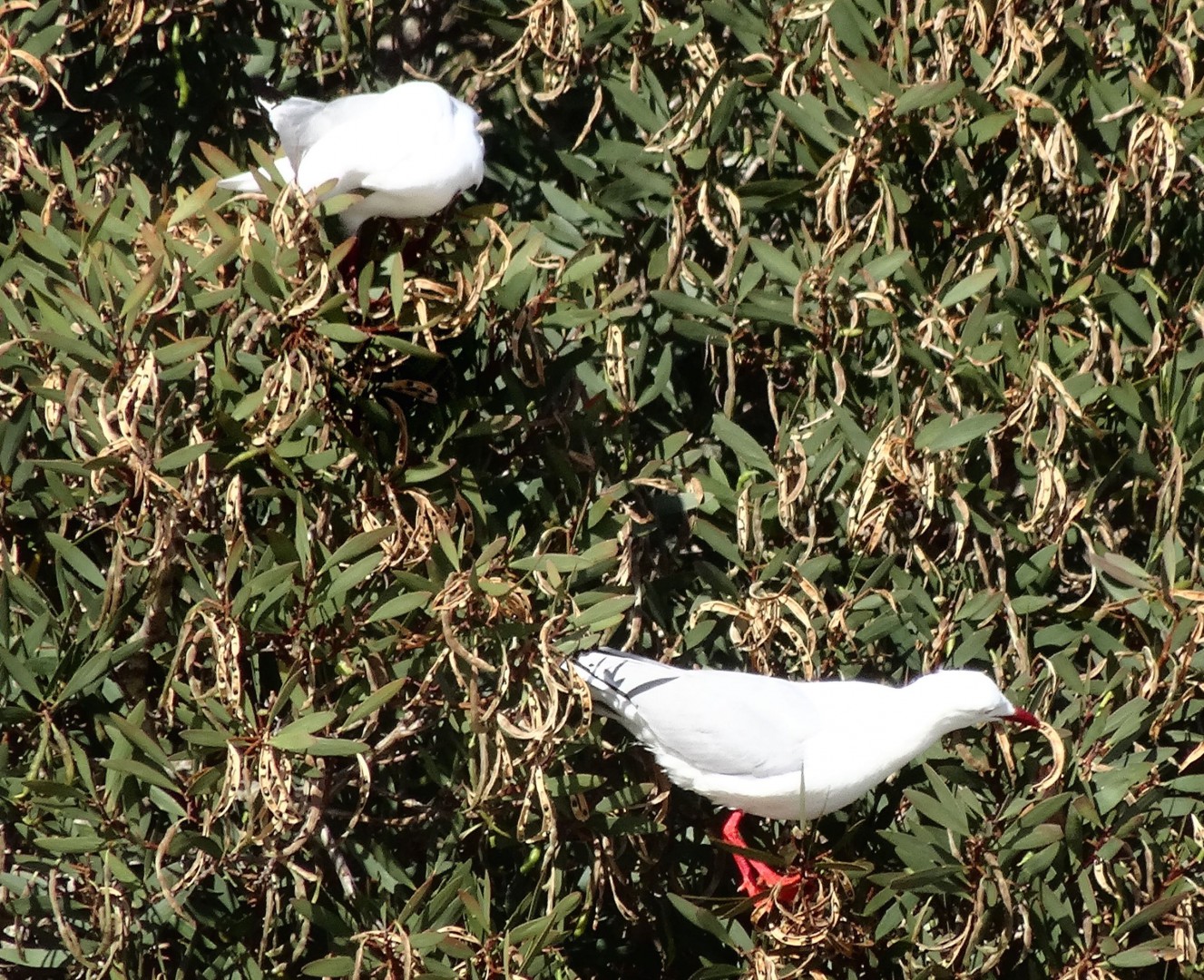 We're at Recherché Bay in Tasmania and here is a different view of seagulls sitting in acacia trees eating seeds. It's what they have to do when there are no McDonalds nearby.