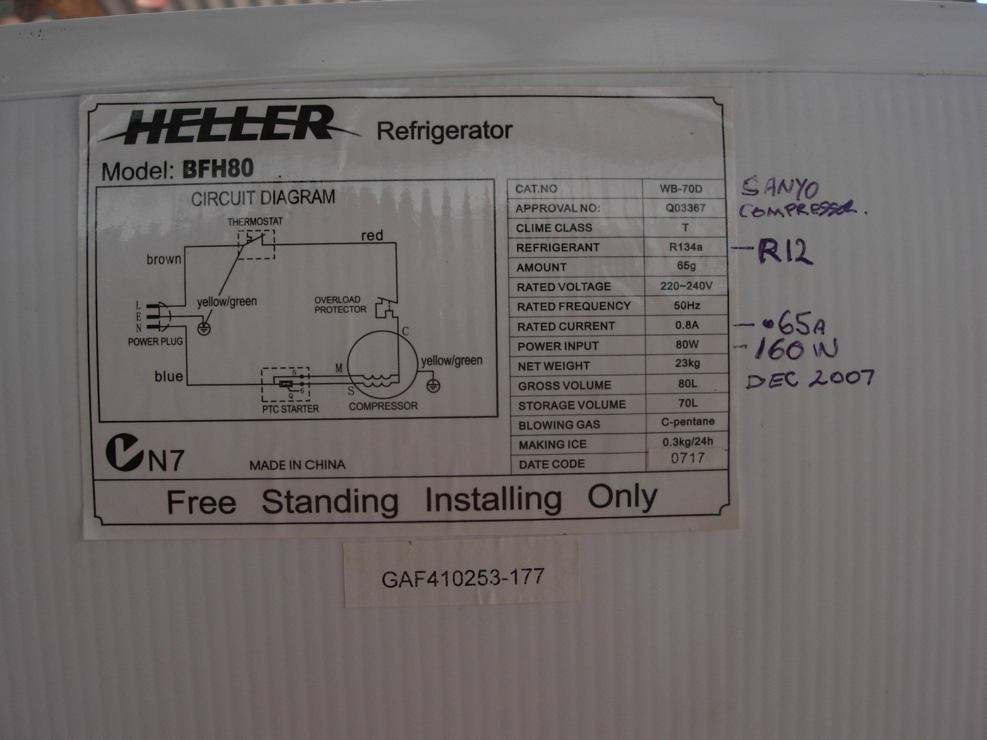 Interesting, heres the specs on the sanyo fridge that the compressor came out off, the 70liter one. The current draw in the orig picture of .45A is with 250V ac.