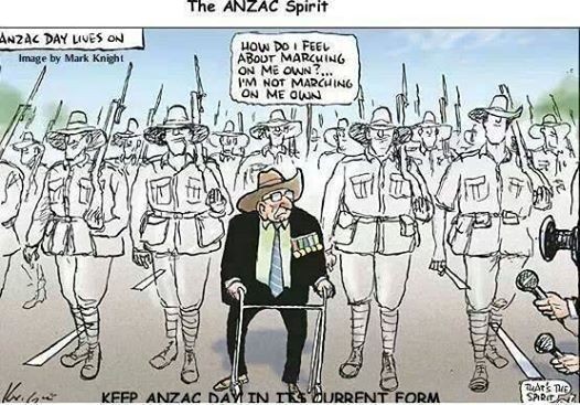 ANZAC Day has always been a special day in our family. As a young child I remember being taken in to the city to watch my father and uncles march and recall how proud I was of their sacrifices. A few years later, the march seemed to become hijacked by yuppies and their wives and kids all wearing someone' else's medals and parading along as if in some sort of self admiration parade. Common sense then took over and these imposters were punted to the rear of the march and so their interest and attention seeking was diminished and they gave it away. As the 100 year celebration came upon us, every D grade celebrity found some lost relative to become misty eyed about to bolster their own credibility. Just when I thought it could not get any worse, I watched the Gallipoli service and here is our prime minister, the same one that denied the service people of their pay rise, talking it up whilst in the crowd sat people with a beanie on, with ANZAC written on the side, and an Australian flag draped around them, like some football supporter.
