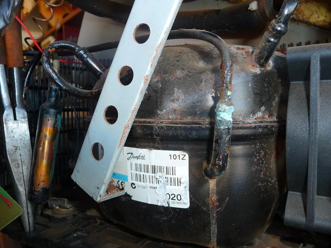 cut out s/b 10.4V and cut in 11.7V (correct?) so supply voltage/voltage drop should not be the problem. i have also bridged the T and C connections to the thermostat - there was no change in function and the compressor does not run. my research suggests a fault in the 101N0220 controller. i have removed the controller and found nothing wrong visually with the internals and would like to test it but can find no info to do so. i also checked for shorts between the 3 pin connector on the compressor side and the compressor housing and found no continuity/shorts. i checked continuity between the three pins on the compressor and found nothing in excess of 2.0ohms between any of the connections. as a result i have concluded there is no short in the compressor. i have noted two points in the refrigerant lines that have slightly rusted and there is some light blue corrosion surrounding the lines. corrosion appears near the thermostatic bulb and the other on the compressor return line best i can tell - is it possible this a refrigerant leak? would that set a cutout code if the refrigerant was low/empty? see pics for a better description of this corrosion.